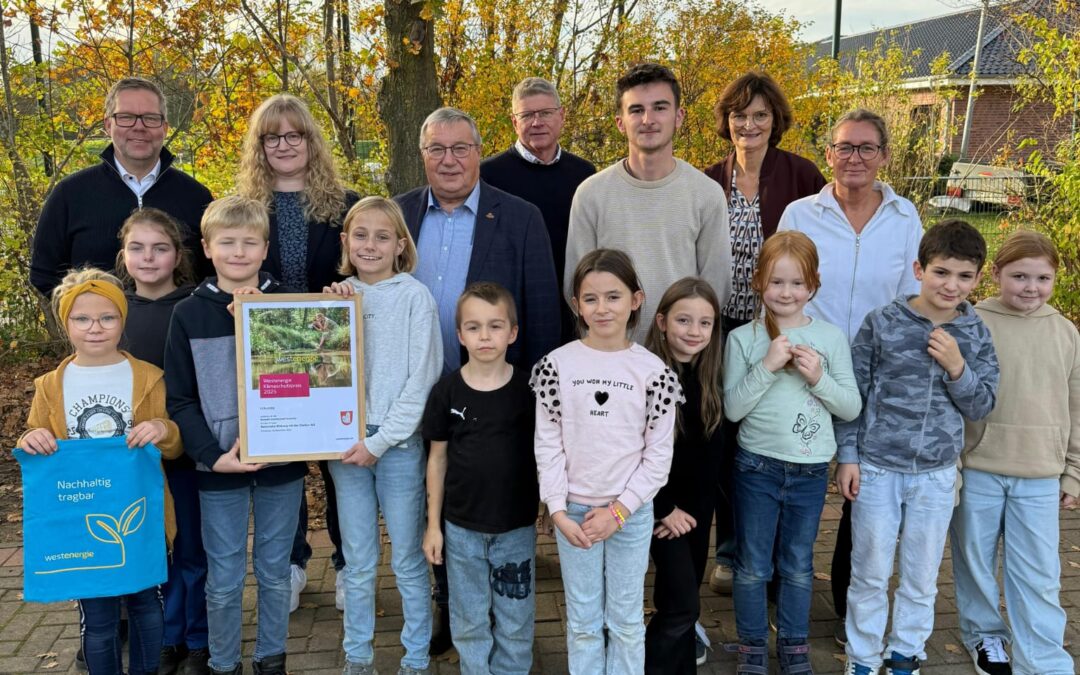 Für das Engagement wurde die Garten-AG unter der Leitung von Wiebke Helmes mit dem Klimaschutzpreis der Westenergie ausgezeichnet. Am 04.11. wurde in Anwesenheit von Vertretern der Verwaltung, des Bürgermeisters und von Westenergie feierlich die Urkunde verliehen, verbunden mit einem Geldpreis in Höhe von 300 €.