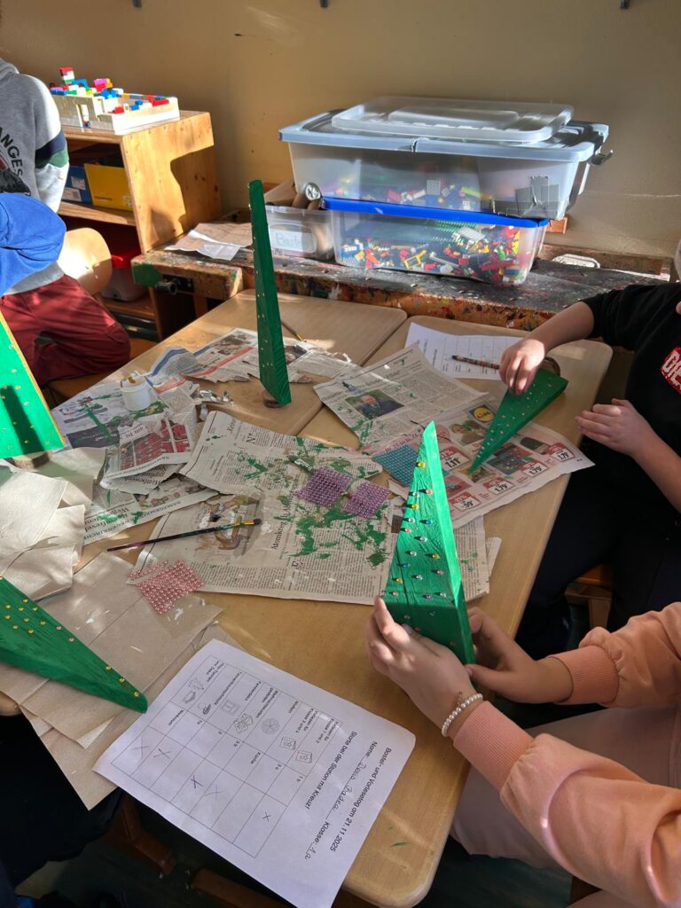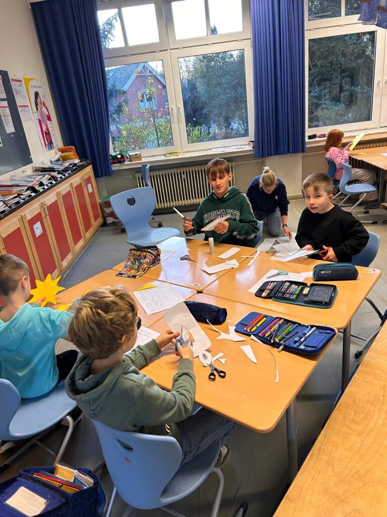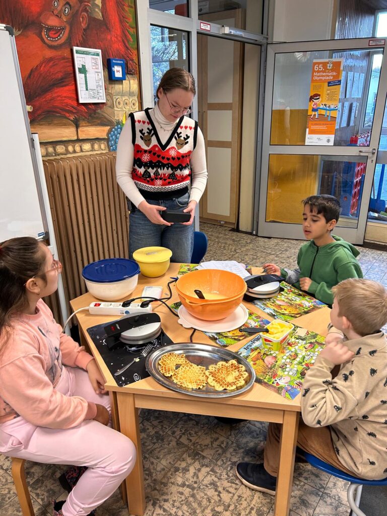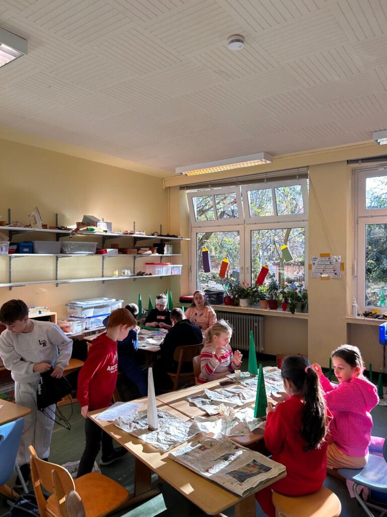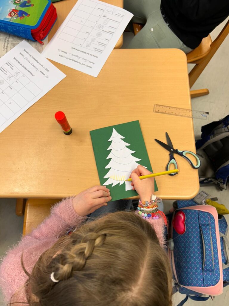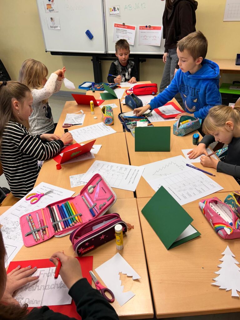 Als Erstes haben wir uns alle in der Eingangshalle getroffen und Frau Bolsmann hat allen Kindern gesagt, an welche Station sie zuerst gehen sollen. Dann sind wir zu den verschiedenen Stationen gegangen. Es wurde Fensterdeko, Tannenbäume aus Holz, Tannenbaumschmuck und Weihnachtskarten gebastelt. Außerdem wurden uns Geschichten vorgelesen und wir durften Waffeln backen.