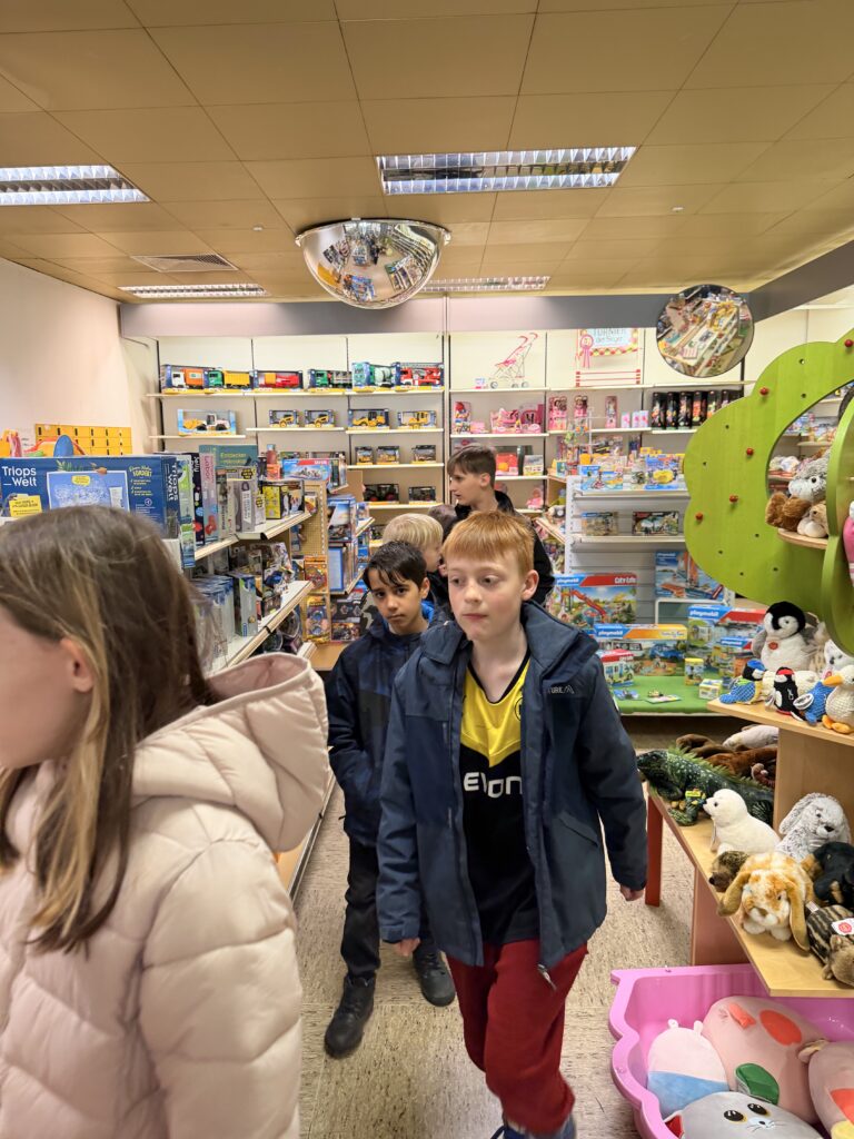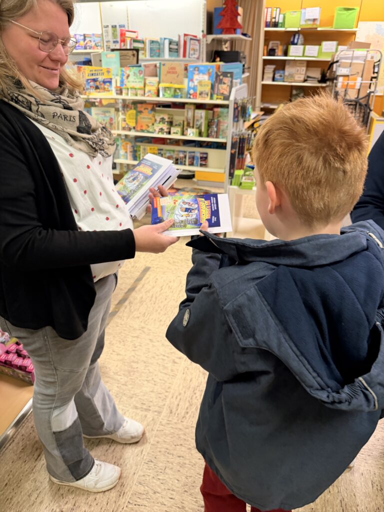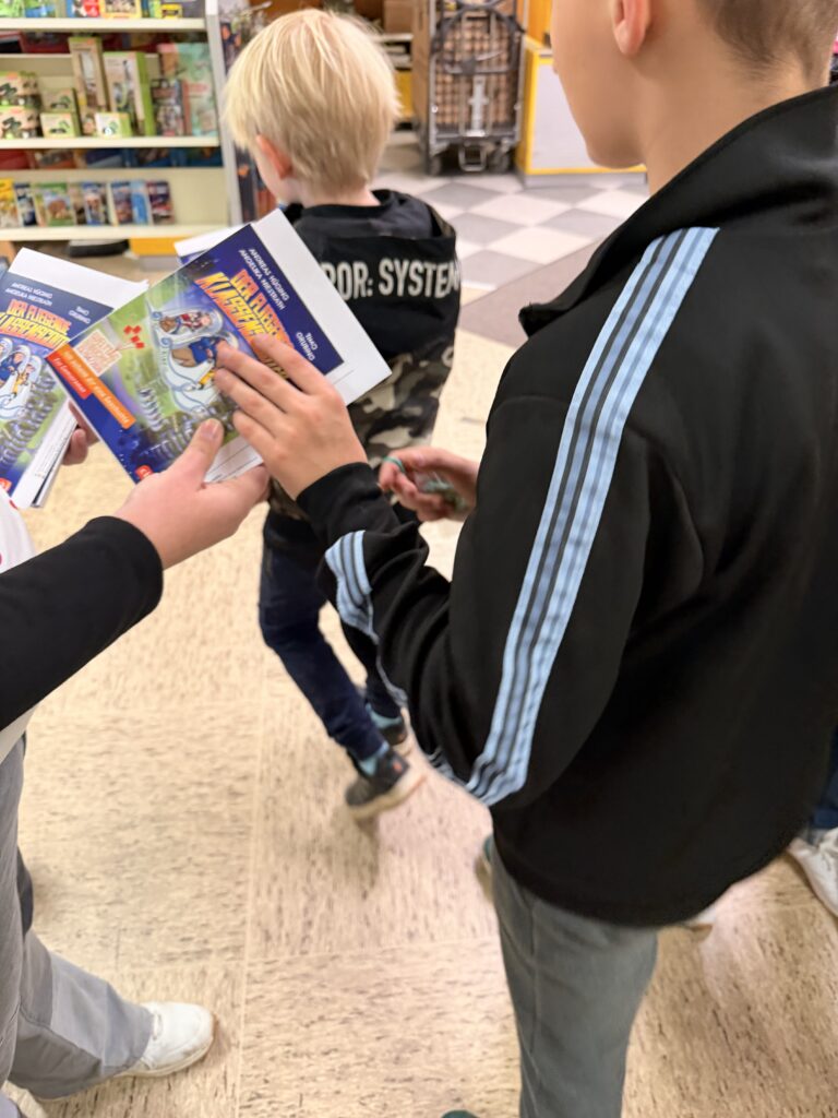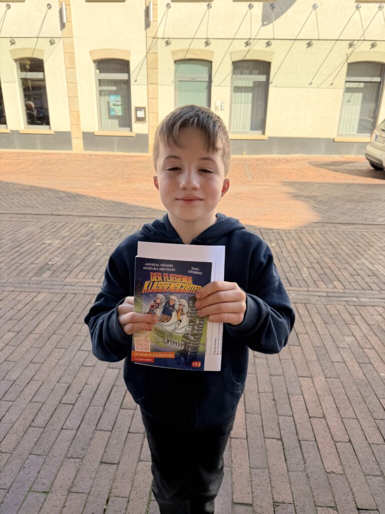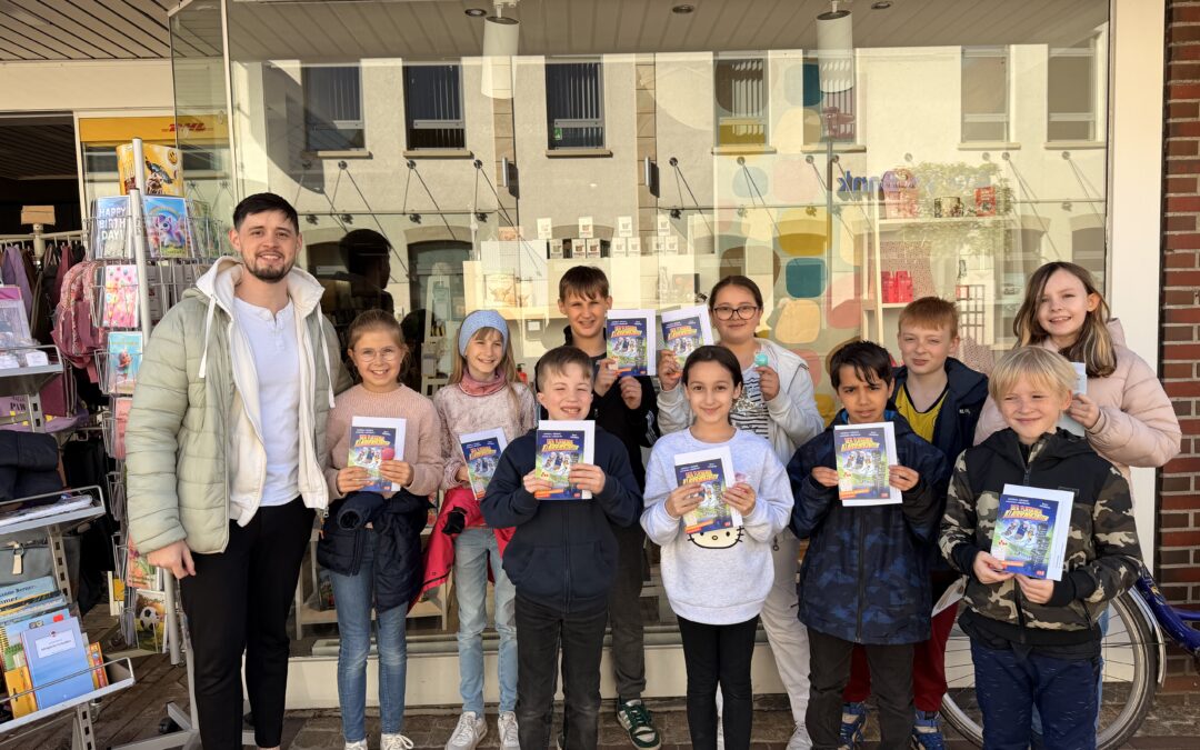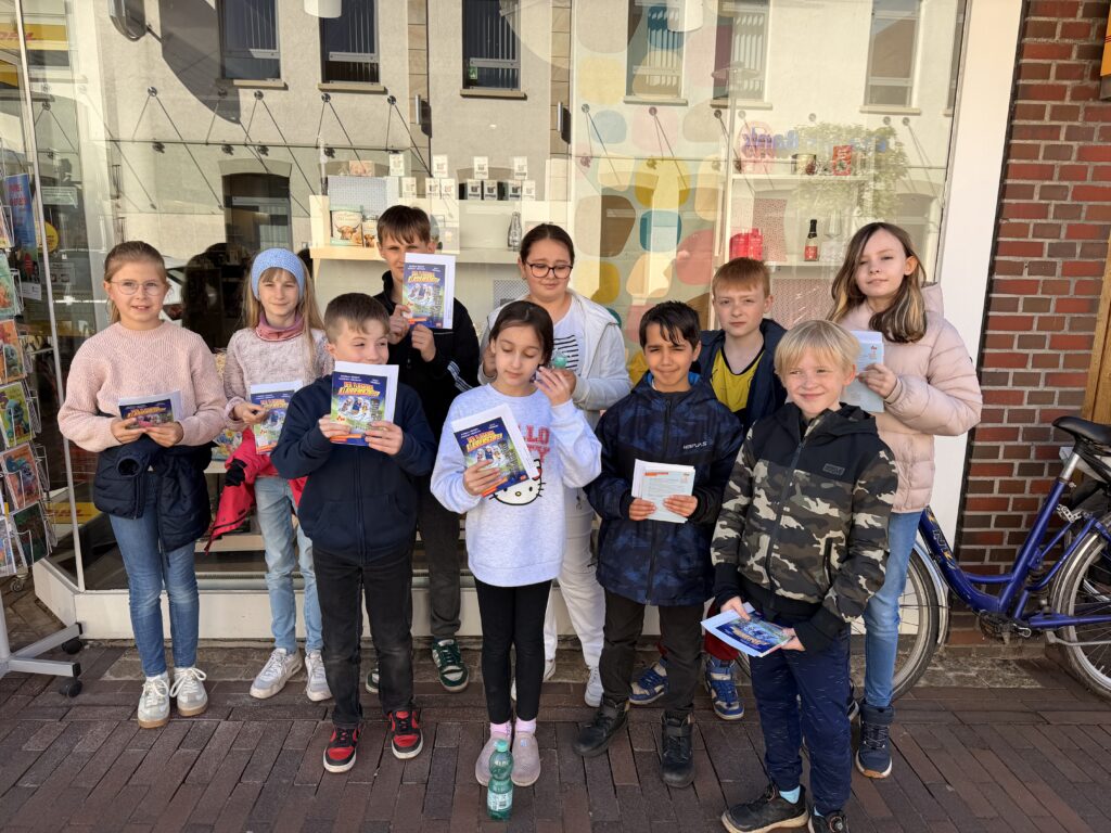 Unsere Klasse 4 hatte heute einen ganz besonderen Ausflug: Gemeinsam besuchten sie im Rahmen des Deutschunterrichts das Schreibwarengeschäft Ludlage in Fürstenau. Anlass war das Leseförderprojekt „Ich schenk dir eine Geschichte“ zum Welttag des Buches, bei dem jedes Kind ein eigenes Buch geschenkt bekam. In diesem Jahr durften sich die Schülerinnen und Schüler über die spannende Geschichte „Der fliegende Klassenscooter“ freuen.